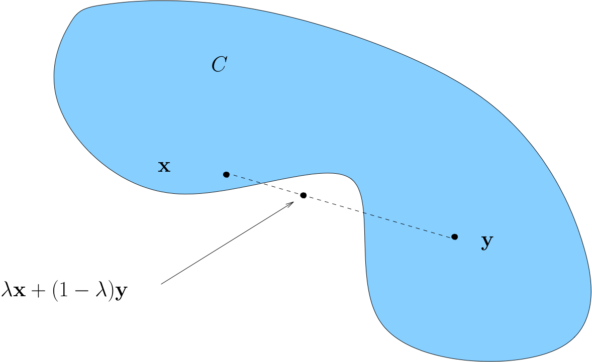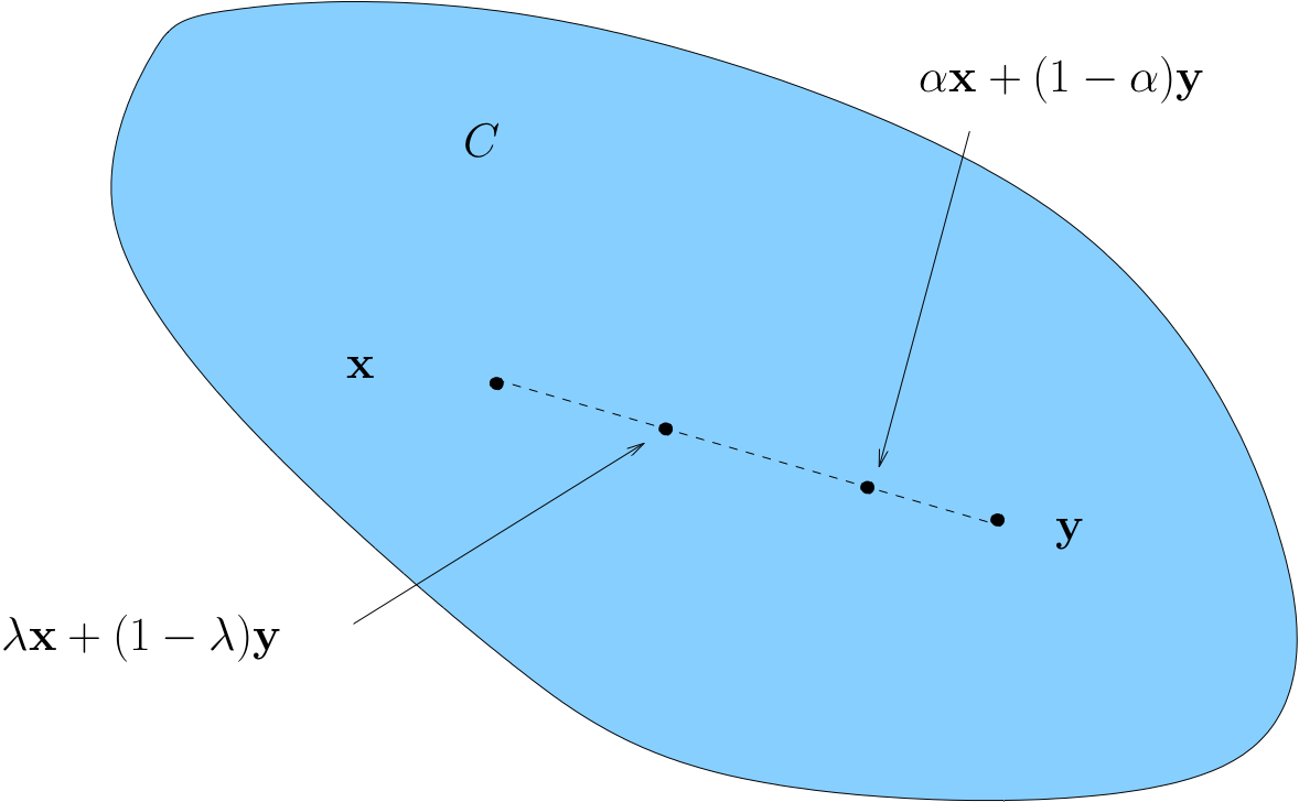Convexity \(\iff\) line between any two points in \(C\) lies in \(C\)