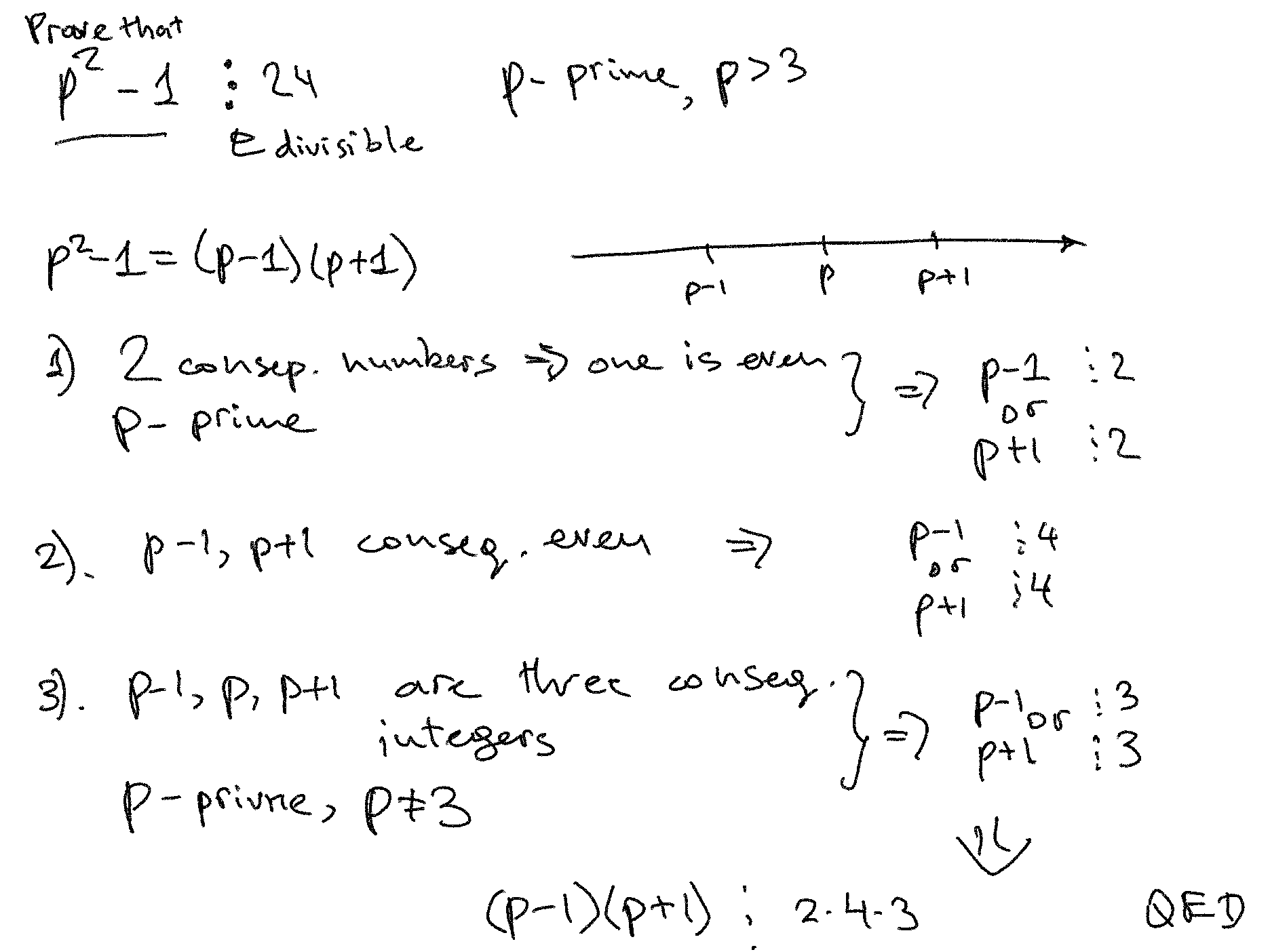 Overall, we have that \(p^2-1 = (p-1)(p+1)\) is divisible by 2, by 4, and by 3, and thus by its product 24. \(\blacksquare\)