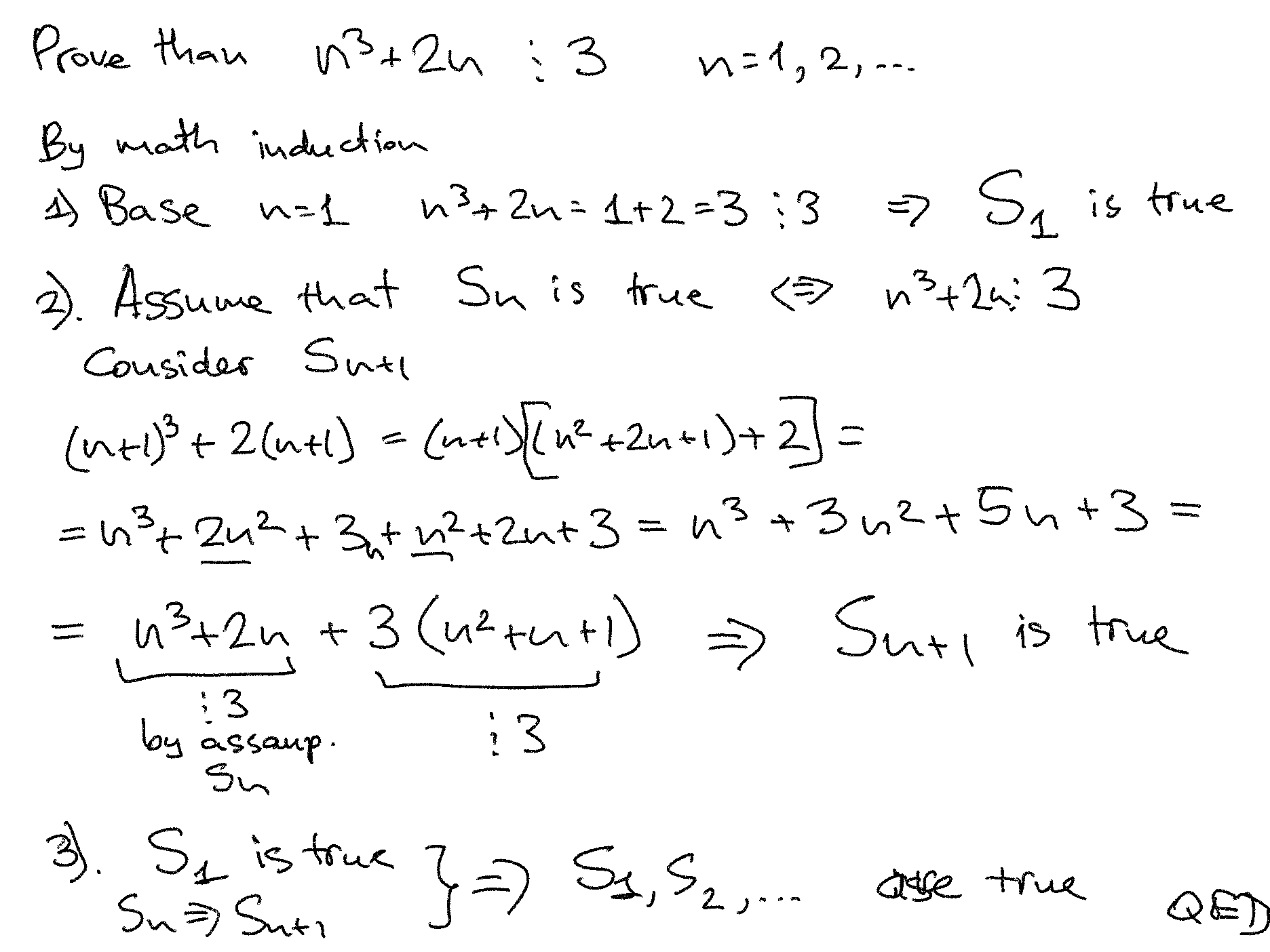Induction step. Assume that \(n^3+2n\) is divisible by 3 for some \(n\), in other words that \(S_n\) is true. The job is to show that it is also true for \(n+1\), i.e. that \(S_{n+1}\) is true.