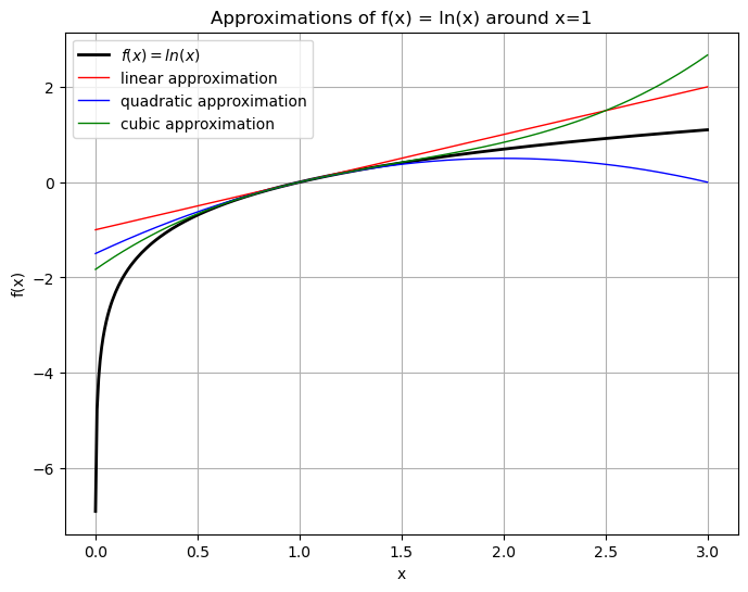 Consider function \(f(x) = \ln(x)\) and let \(a=1\). Let’s approximate \(f(x)\) with Taylor series at \(a=1\).