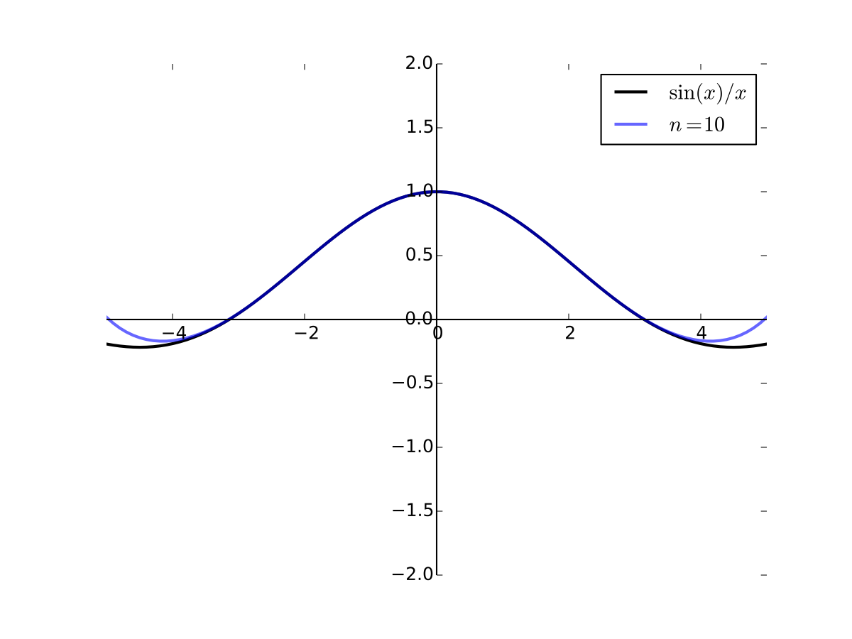 Fig. 30 10th order Taylor series for \(f(x) = \sin(x)/x\) at 0#