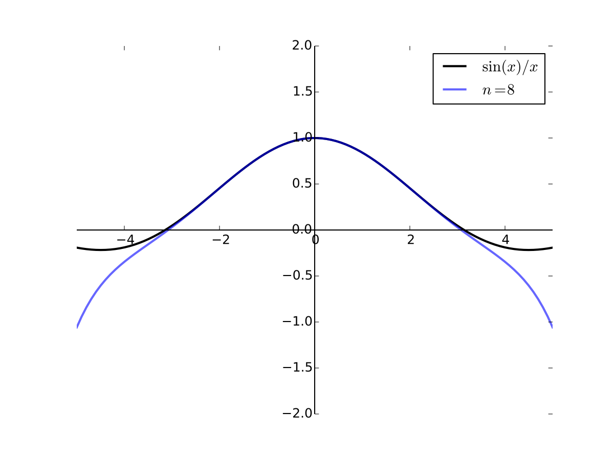 Fig. 29 8th order Taylor series for \(f(x) = \sin(x)/x\) at 0#