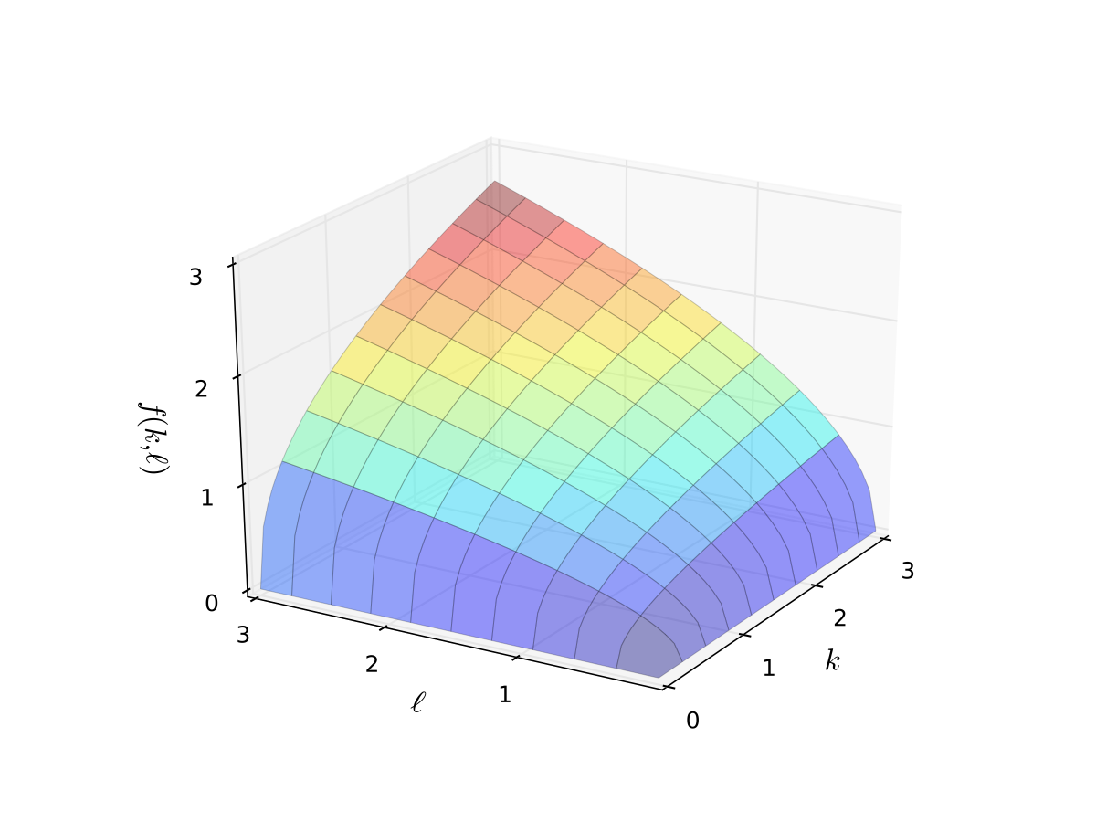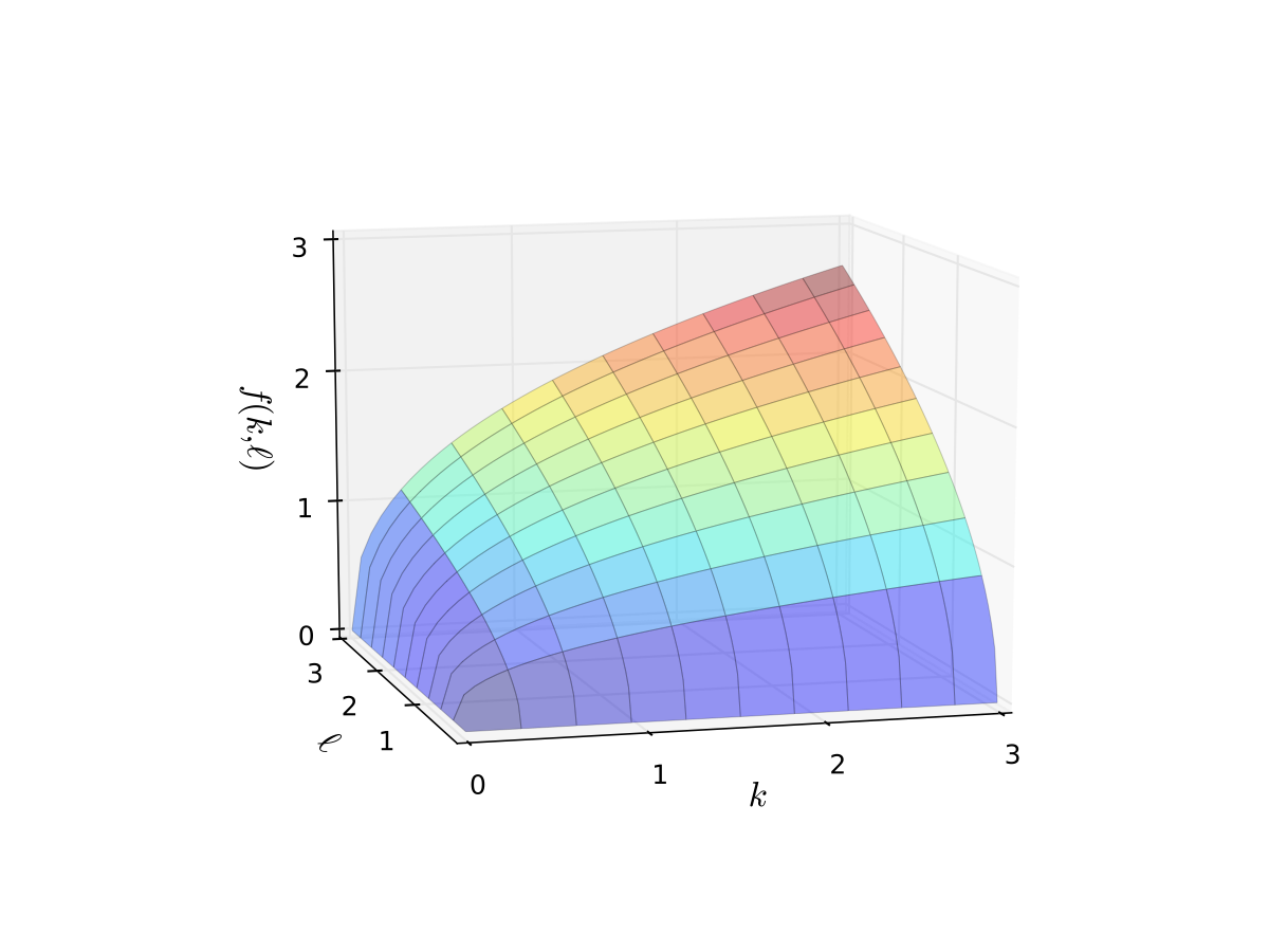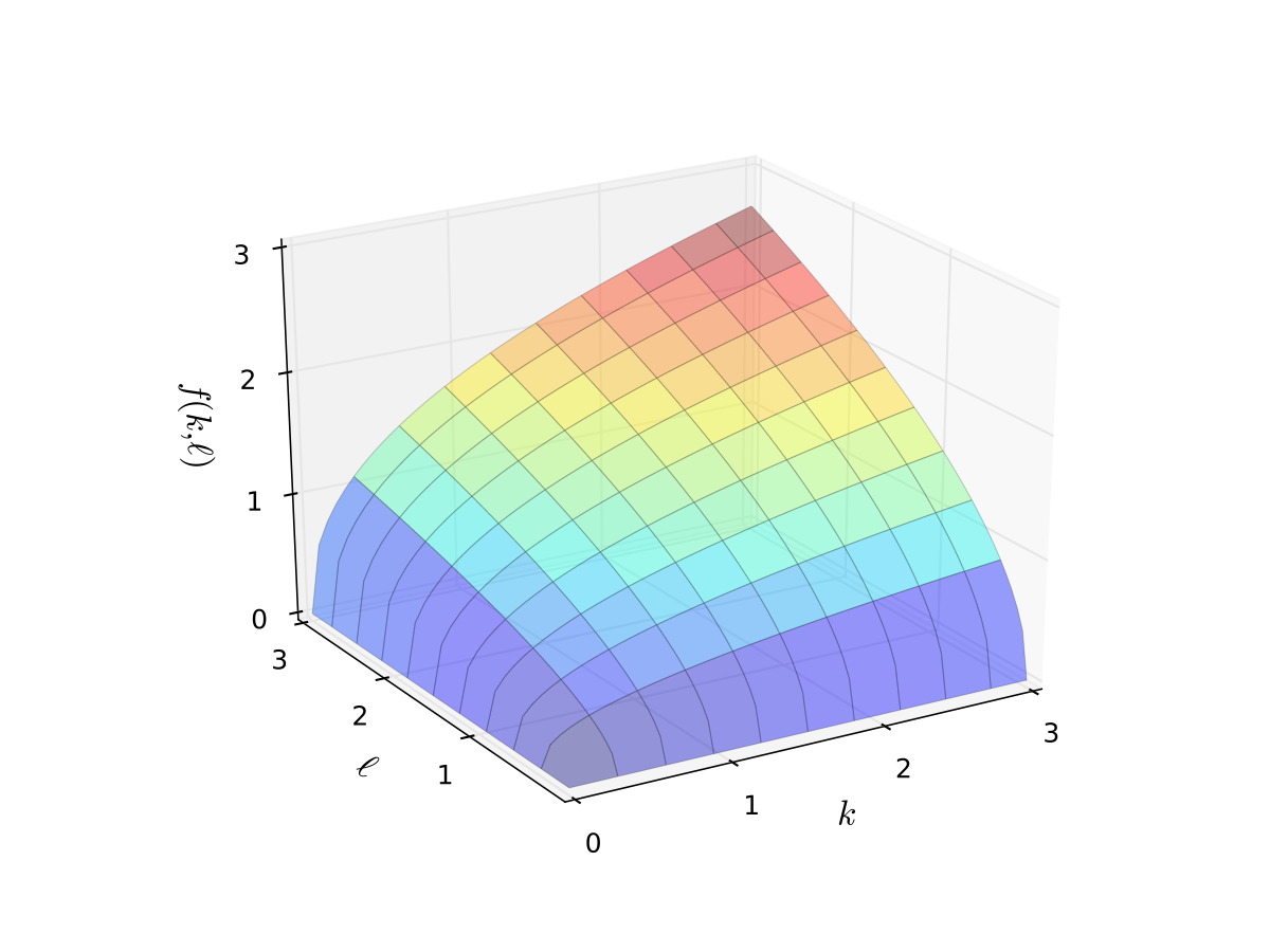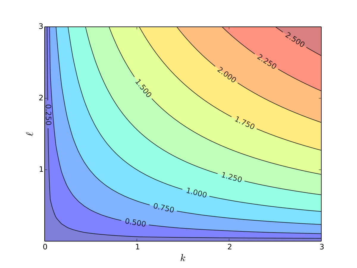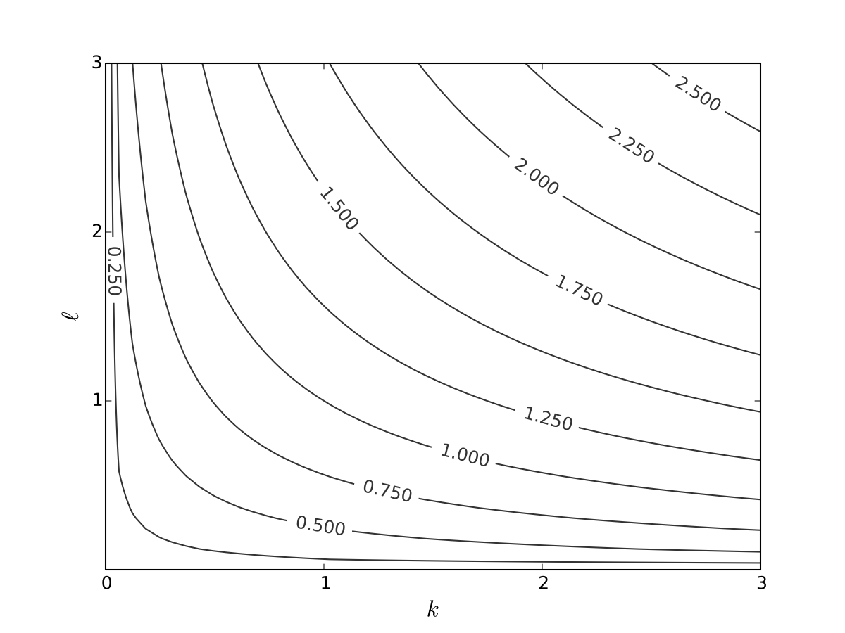 Level curves for the production function \(f(k, \ell) = k^{\alpha} \ell^{\beta}\) with \(\alpha=0.4\), \(\beta=0.5\)