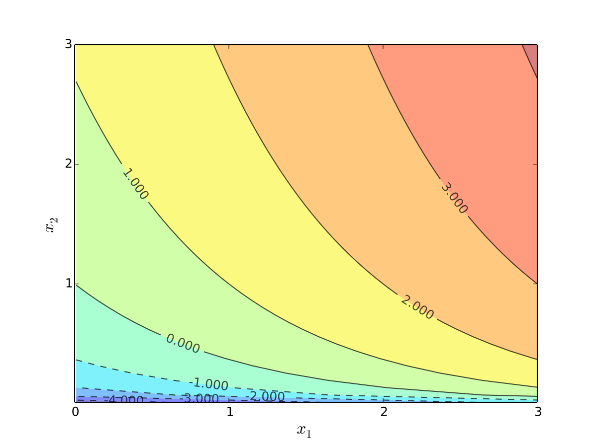 Consider the single-real-valued multivariate function \(f(x_1,x_2) = \sqrt{x_1 - 1} + \sqrt{x_2 - 2}\).